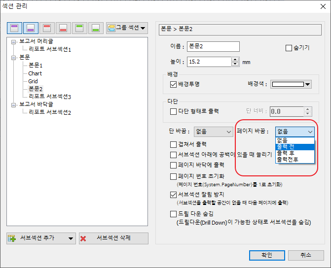 출력 전 : 해당 서브섹션 위를 잘라서 페이지 변경