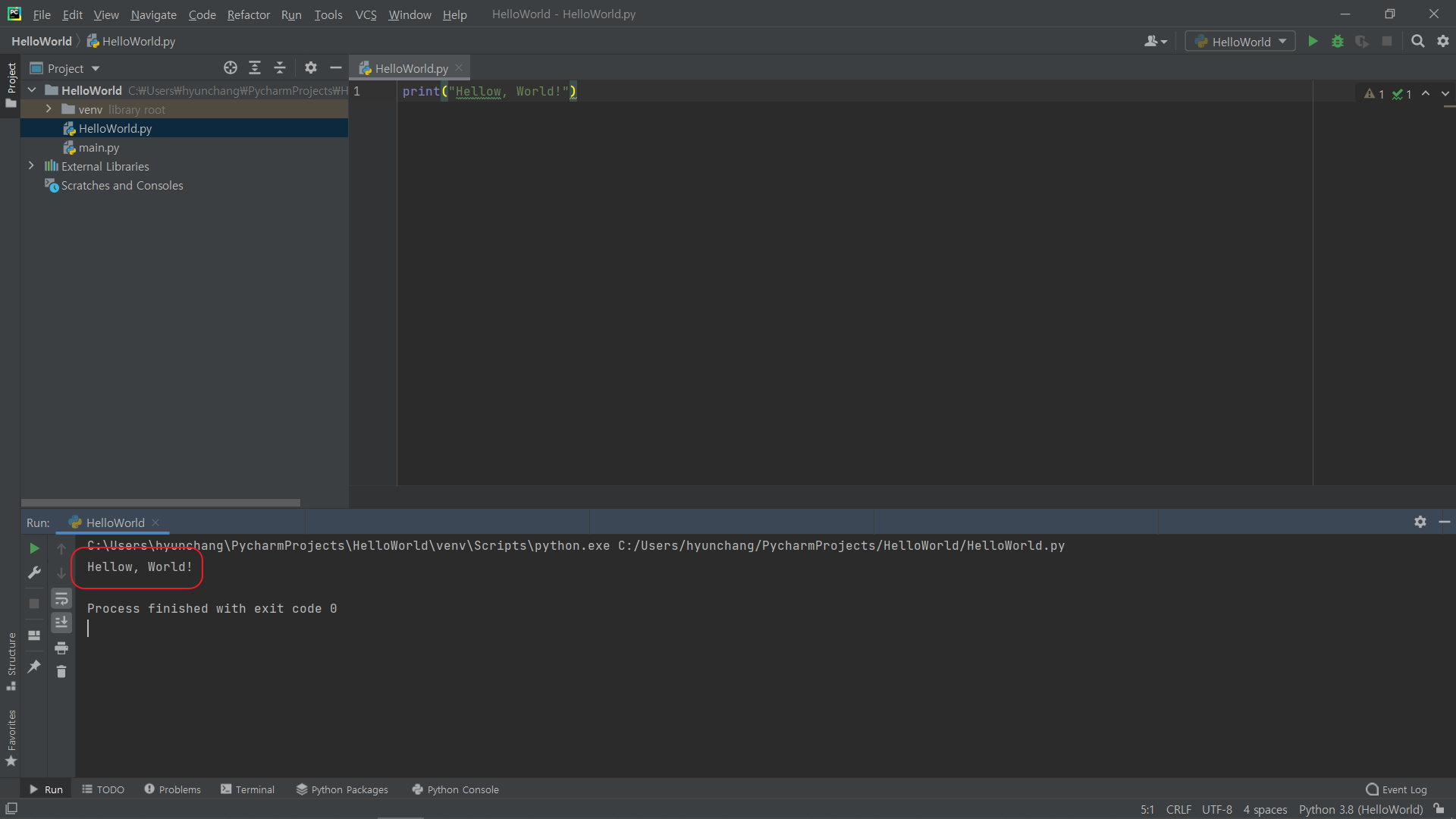 print("Hellow, World!") 를 코딩 후 프로젝트 우클릭 -> Run 프로젝트명 을 선택해 주면