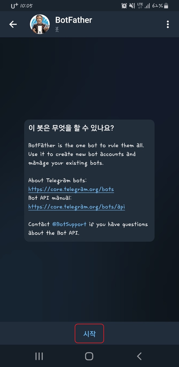 그러면 봇이 할수 있는 것들에 대해 간단한 설명이 있으니 읽어보시구 아래에 시작을 눌러줍니다.