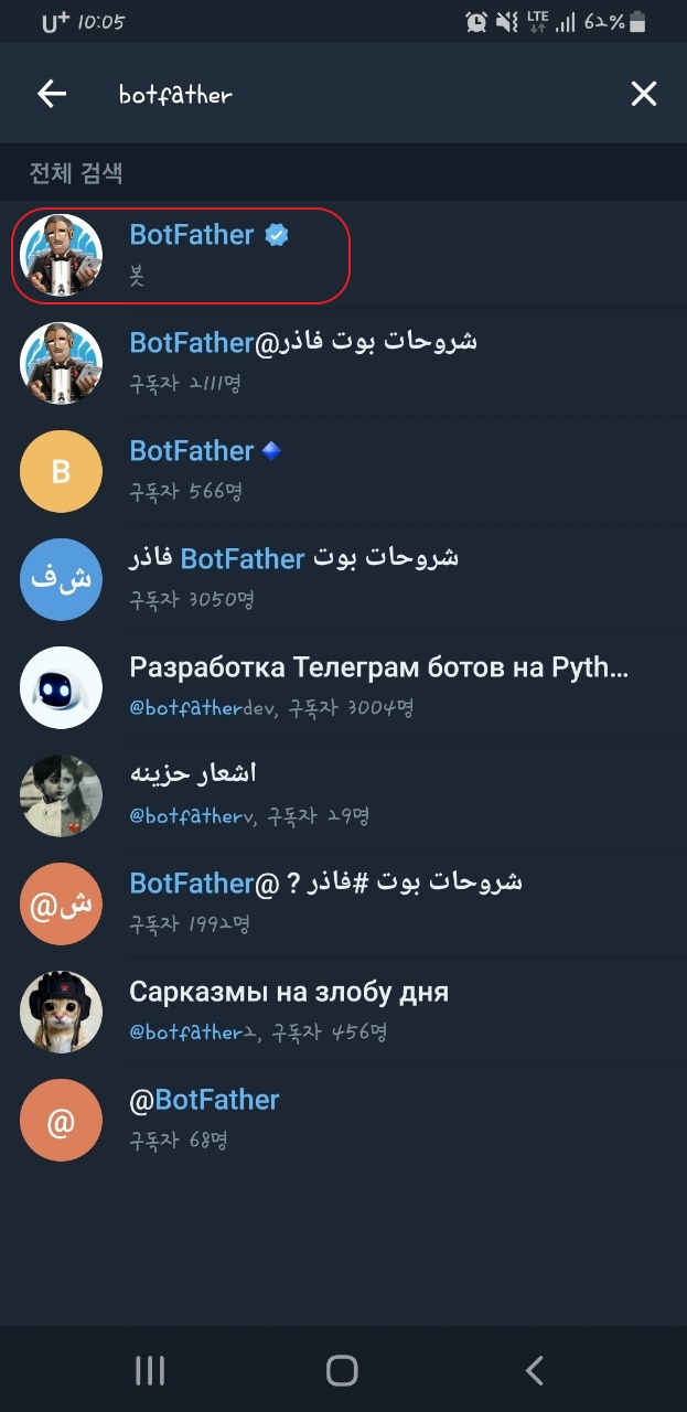 텔레그램 어플을 받아서 로그인 후에 검색창에 botfather를 입력해줍니다.