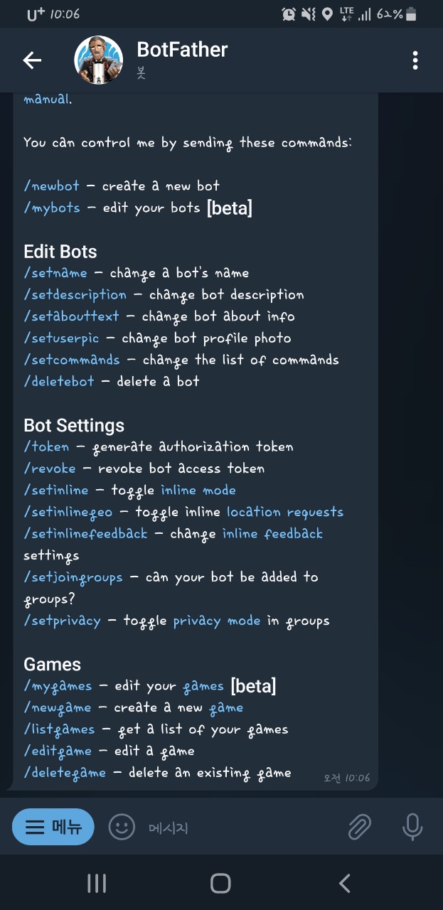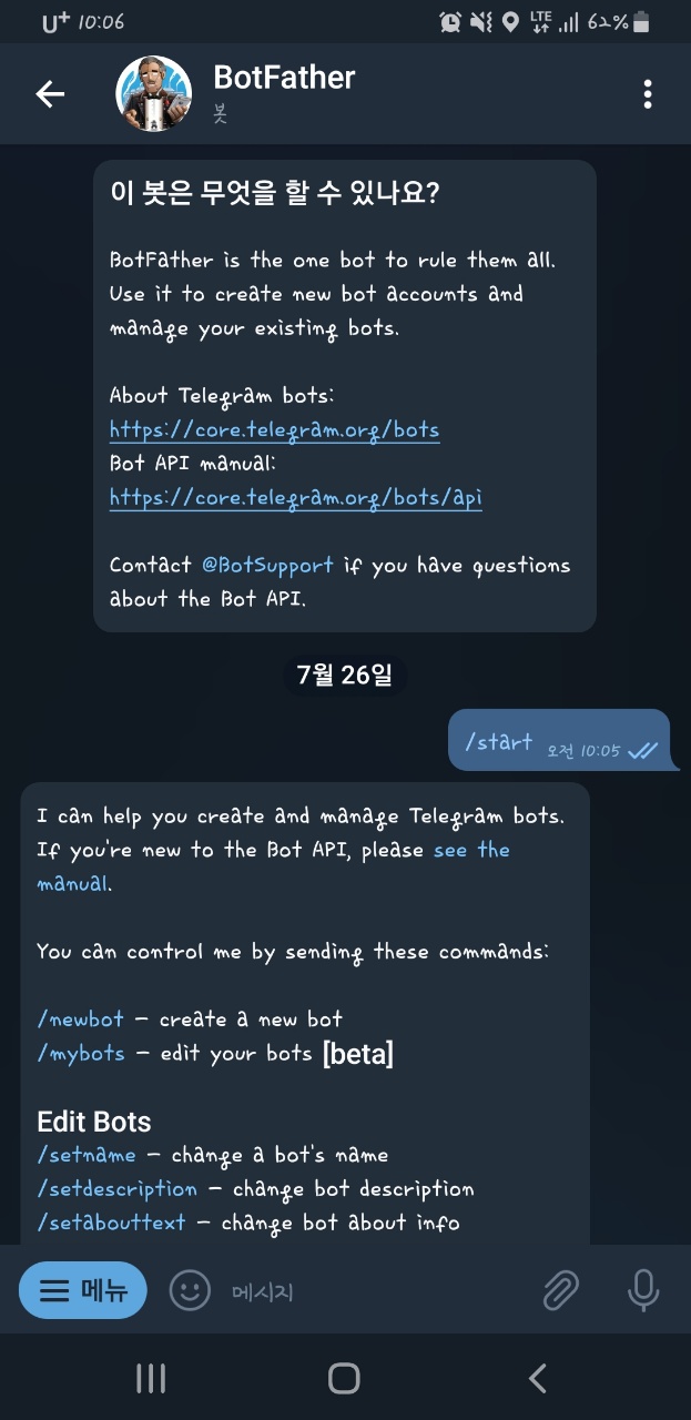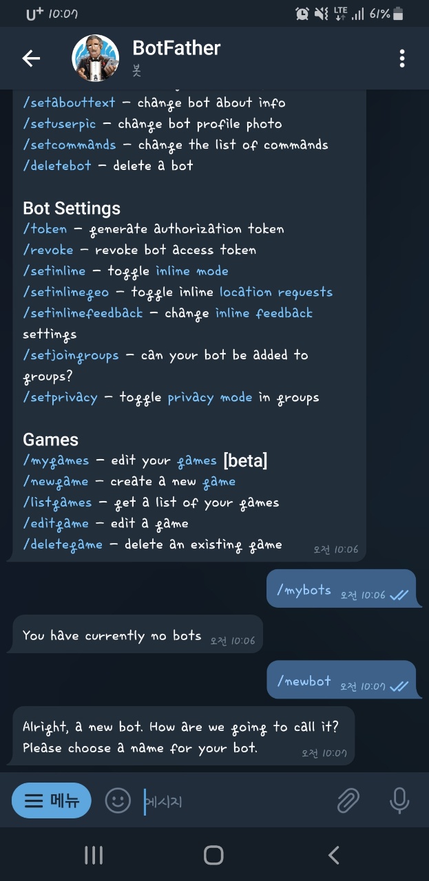/newbot를 입력해 줍니다.전 예전에 만든적이 있어서 혹시나 있나 싶어 /mybot을 입력해 봤는데 없다고 뜨는군요? 삭제되었나?? ㅎ;