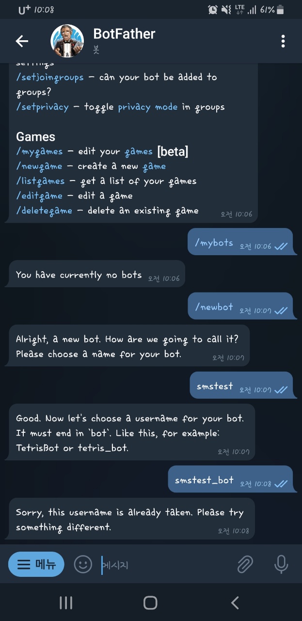 _bot 이런식으로 뒤에 bot을 붙여 달라고 해서 붙였더니 있는 이름이라고...