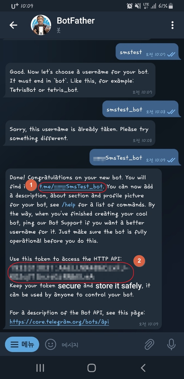 위 사진에서 ①은 텔레그램 봇 주소이고, ②는 텔레그램 봇의 API 토큰 값 입니다.