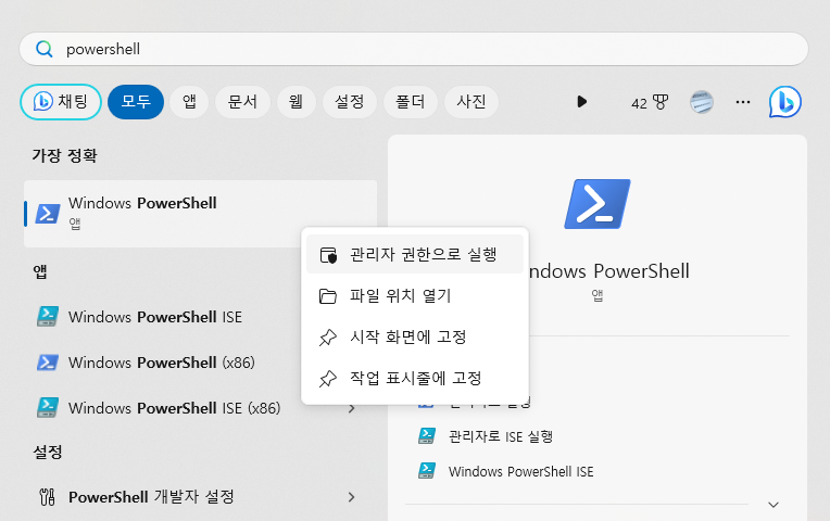 작업표시줄에서 powershell 검색해서 관리자 권한으로 실행한 다음에