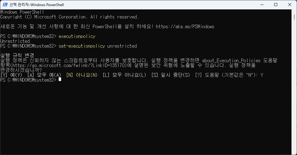 실행 정책은 신뢰하지 않는 스크립트로부터 사용자를 보호합니다. 실행 정책을 변경하면 about_Execution_Policies 도움말