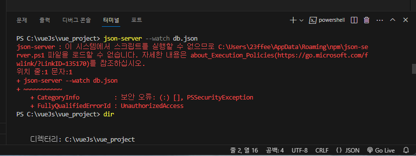 json-server : 이 시스템에서 스크립트를 실행할 수 없으므로~~ 이런 에러가 발생했다...